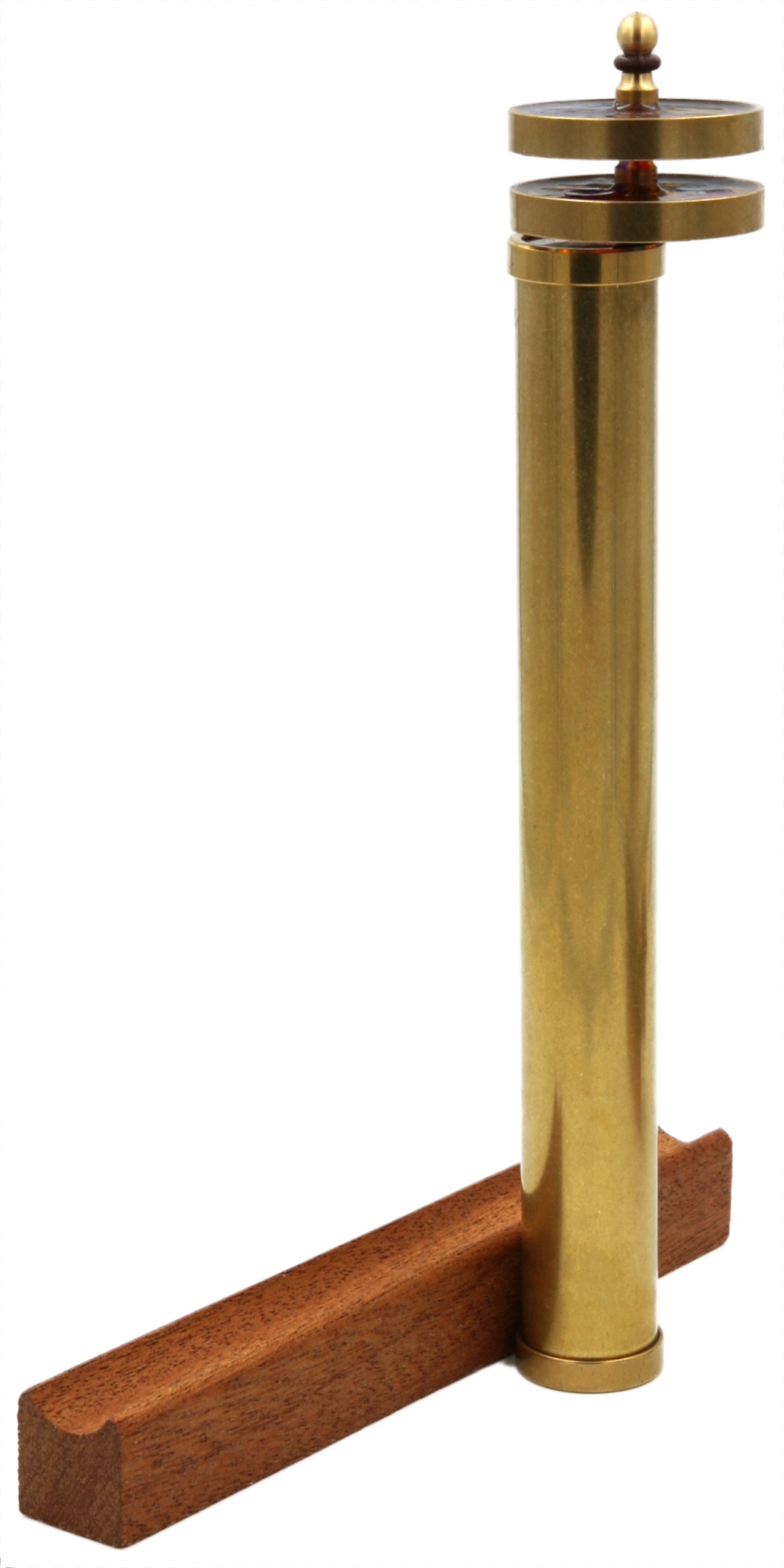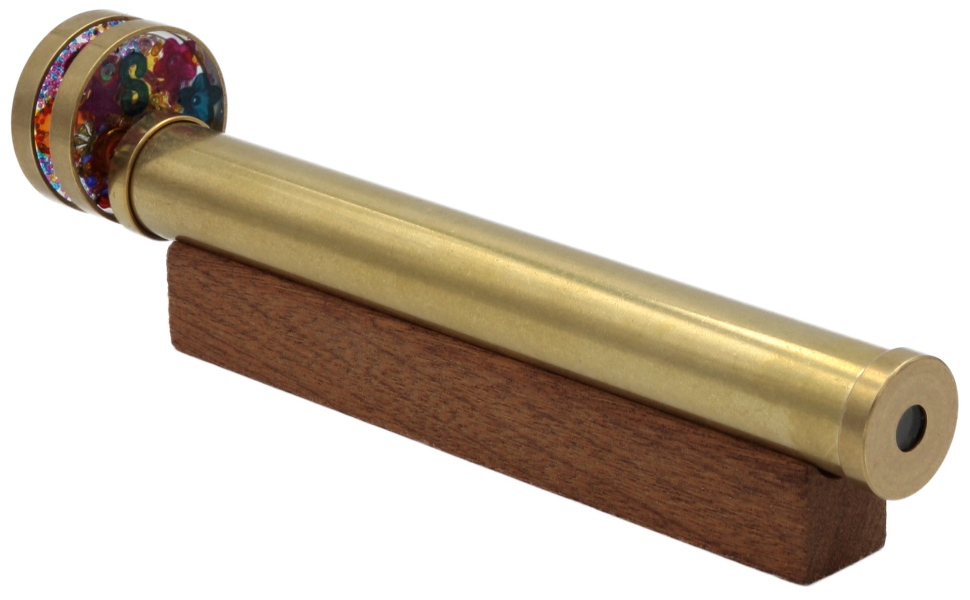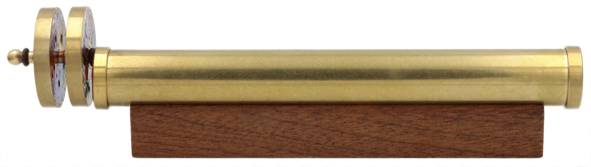 Qualitativ sehr hochwertiges Messing-Kaleidoskop mit Doppel-Drehscheibe, welches in Handarbeit vom Kaleidoskop-Künstler Roy Cohen aus Israel hergestellt wurde. Zur einzigartigen Optik des Kaleidoskops gehören leichte Unregelmäßigkeiten sowie feine Kratzer auf der Oberfläche. Jedes Exemplar ist ein Einzelstück und wird inklusive Ständer geliefert.