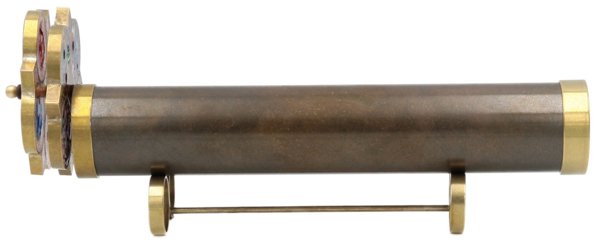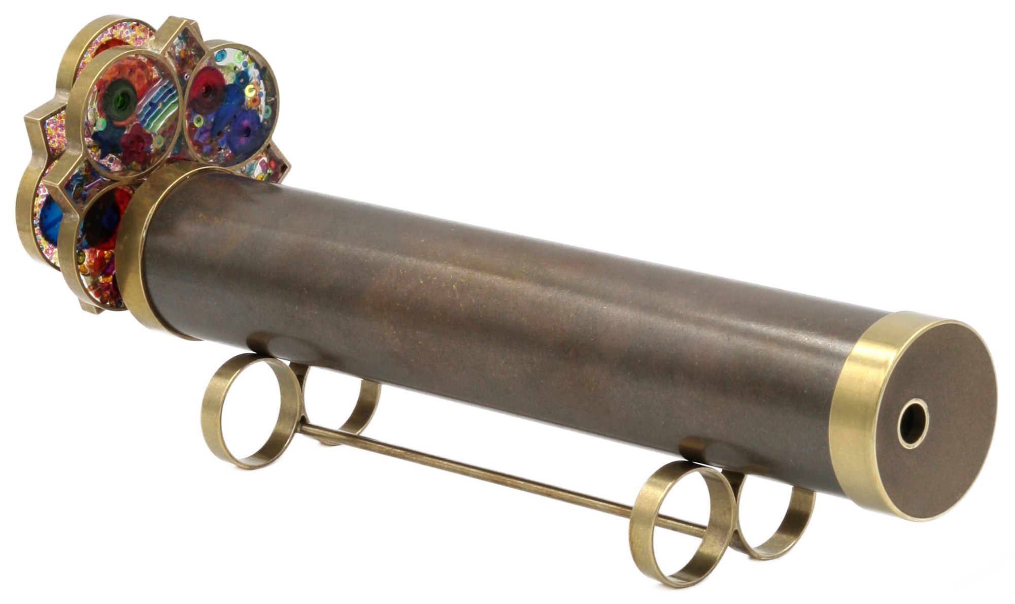 Qualitativ sehr hochwertiges Messing-Kaleidoskop mit Doppel-Drehscheibe, welches in Handarbeit vom Kaleidoskop-Künstler Roy Cohen aus Israel hergestellt wurde. Zur einzigartigen Optik des Kaleidoskops gehören leichte Unregelmäßigkeiten sowie feine Kratzer auf der Oberfläche. Jedes Exemplar ist ein Einzelstück und wird inklusive Ständer geliefert.