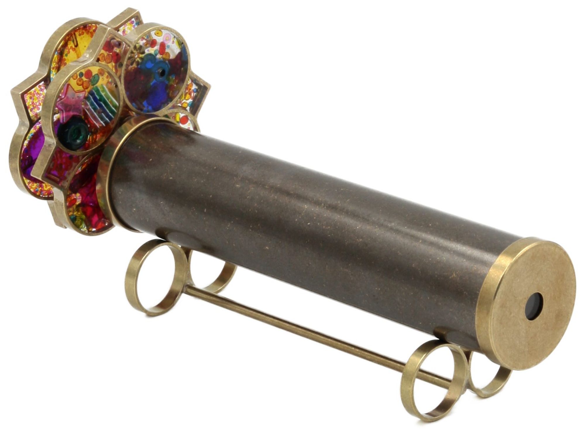 Qualitativ sehr hochwertiges Messing-Kaleidoskop mit Doppel-Drehscheibe, welches in Handarbeit vom Kaleidoskop-Künstler Roy Cohen aus Israel hergestellt wurde. Zur einzigartigen Optik des Kaleidoskops gehören leichte Unregelmäßigkeiten sowie feine Kratzer auf der Oberfläche. Jedes Exemplar ist ein Einzelstück und wird inklusive Ständer geliefert.