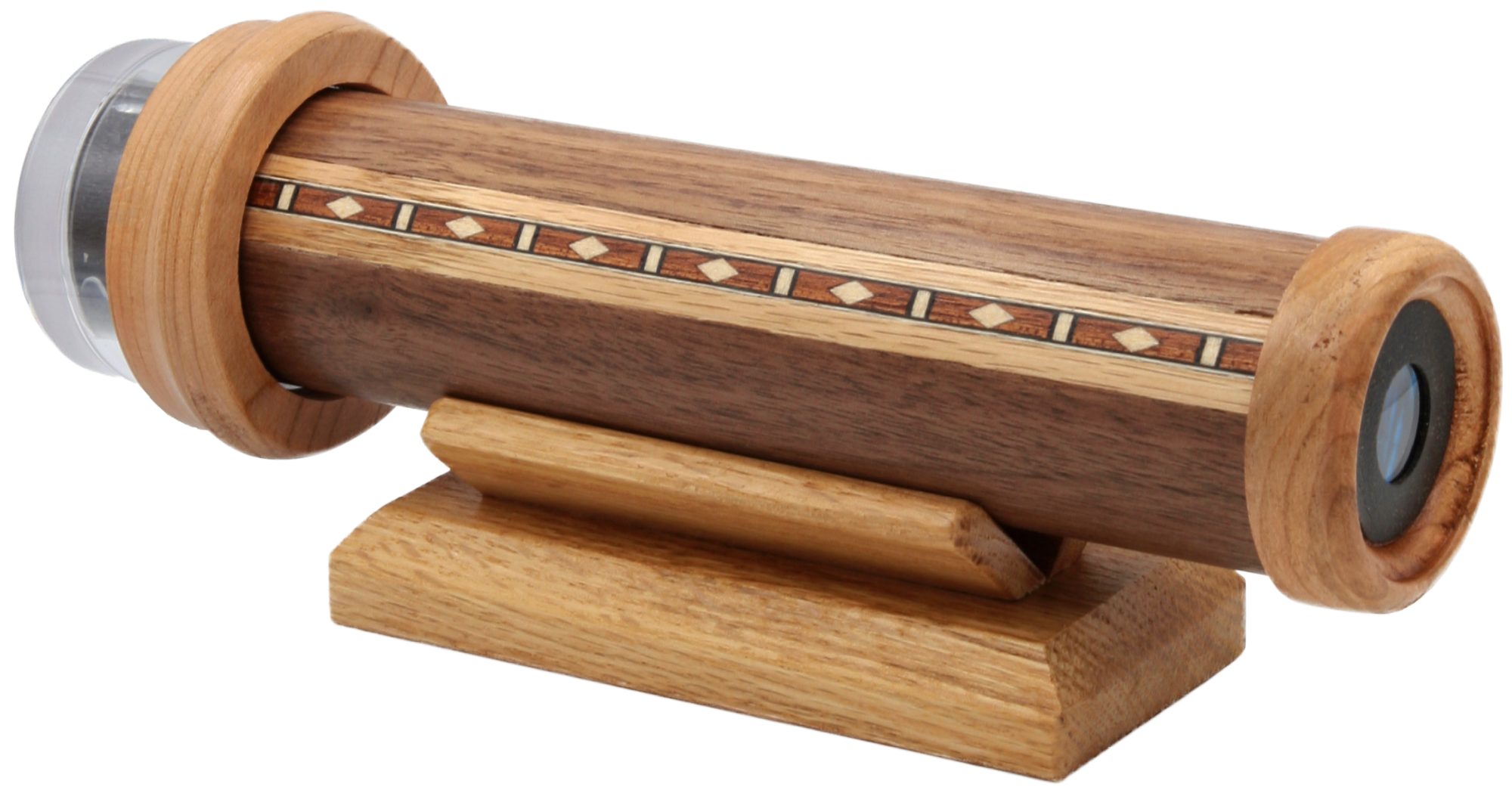 Ein wirklich spannendes und qualitativ sehr hochwertiges Wechselobjekt-Kaleidoskop aus Nussbaum mit Ringen aus Kirschholz, welches in Handarbeit vom Kaleidoskop-Künstler Craig Vanderwaal aus den USA hergestellt wurde. Jedes Exemplar ist ein Einzelstück und wird inklusive Ständer, zwei unterschiedlichen Füllungen, einer Flüssigkeitskapsel und einer Wendescheibe zum Ändern der Hintergrundfarbe geliefert.